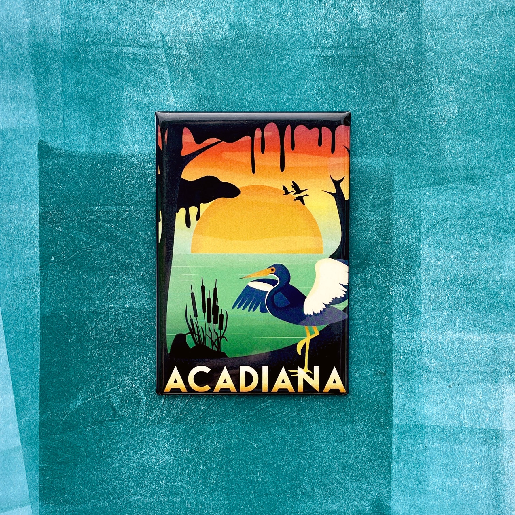 Bring home the beauty of Cajun country with the Acadiana Poster Magnet. This vibrant keepsake shrinks your beloved poster into a handy magnet, capturing a serene heron silhouetted against a warm, swamp sunset framed by cypress moss and drifting birds. It’s the perfect way to keep a piece of Acadiana charm right on your fridge, locker, or magnet board.