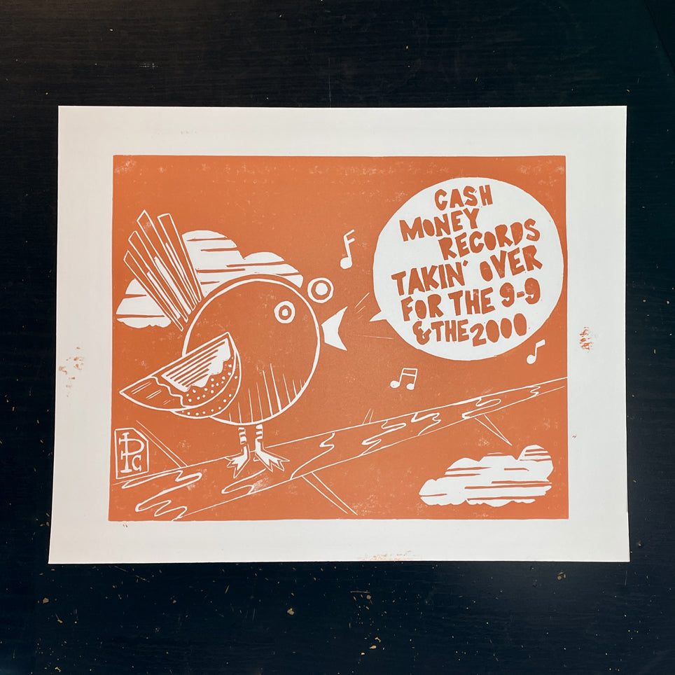 This is a hand-pressed block print. The design is first hand drawn, transferred to a block. I then carve it out, ink and press onto paper one at a time.
