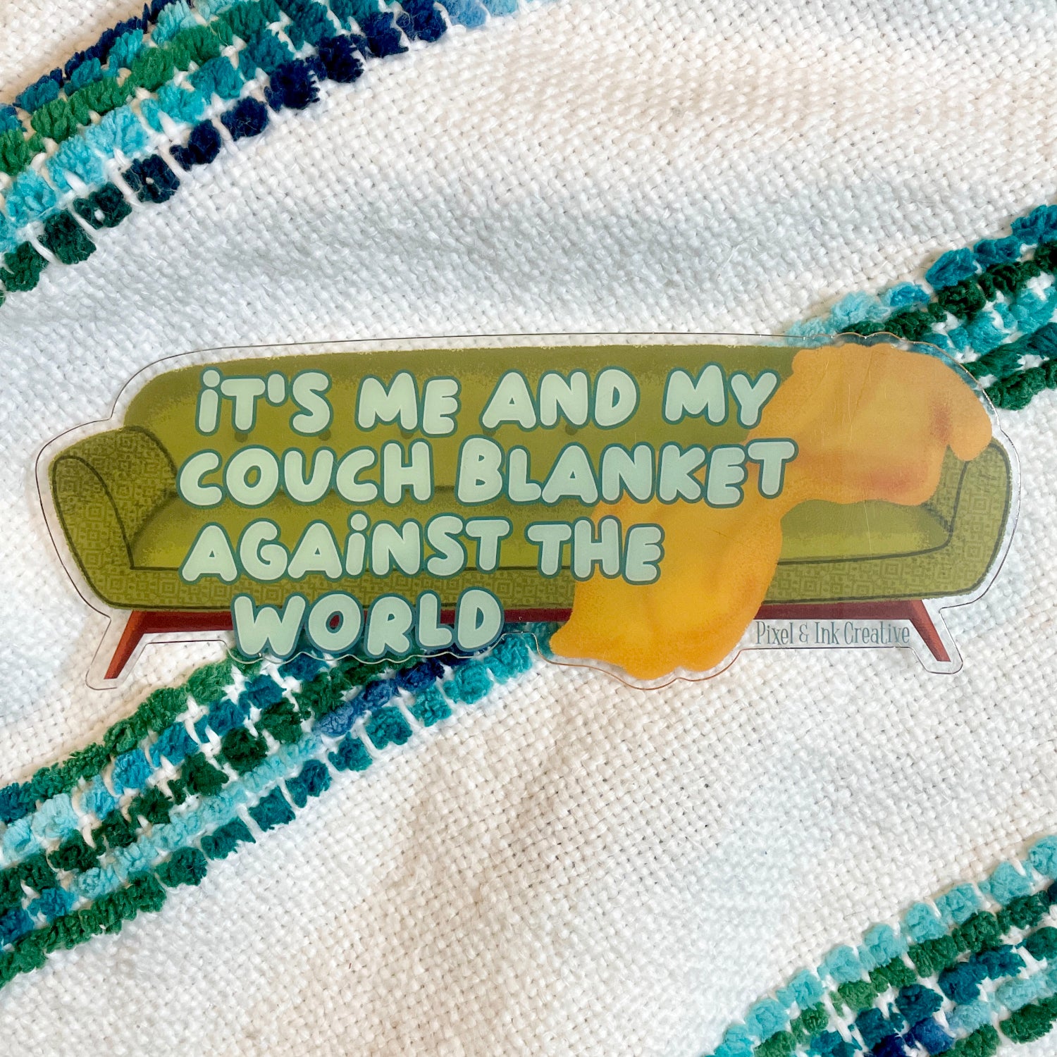 Proudly proclaim your love of comfort with this "It's Me and My Couch Blanket Against the World" Bookmark. Add this bookish accessory to your lounging routine with this Couch Blanket PVC die-cut bookmark!