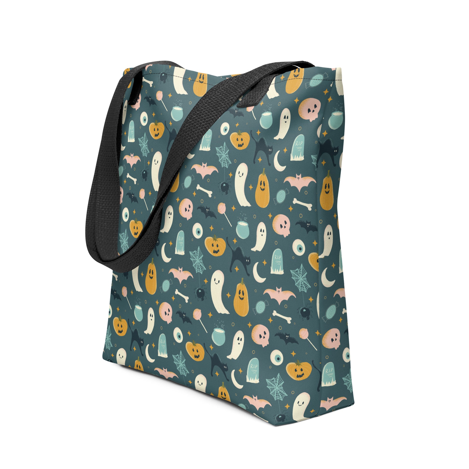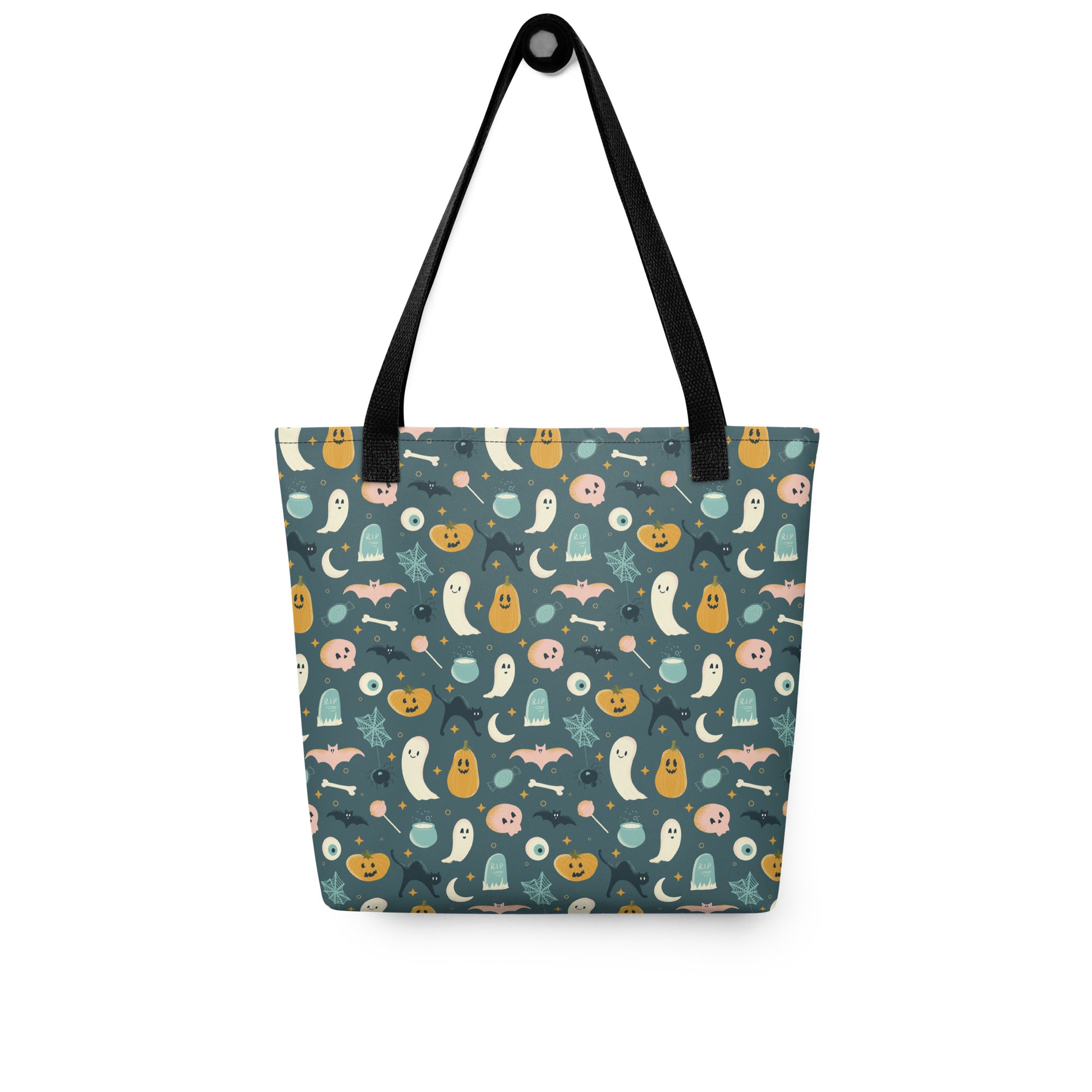 Get ready for fall adventures with this Cute & Spooky Halloween Tote Bag! Featuring an adorable mix of ghosts, jack-o-lanterns, eyeballs, candies, black cats, and more, this tote is perfect for carrying your tricks or treats in style.