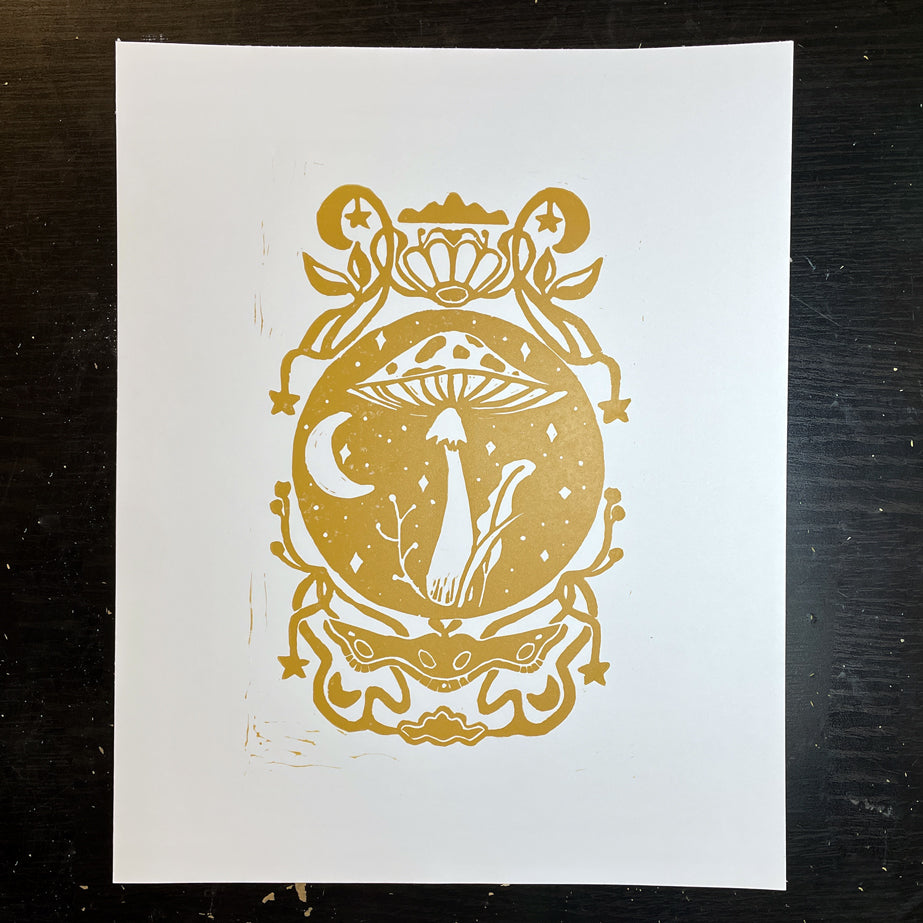 This is a hand-pressed block print. The design is first hand drawn, transferred to a block. I then carve it out, ink and press onto paper one at a time.