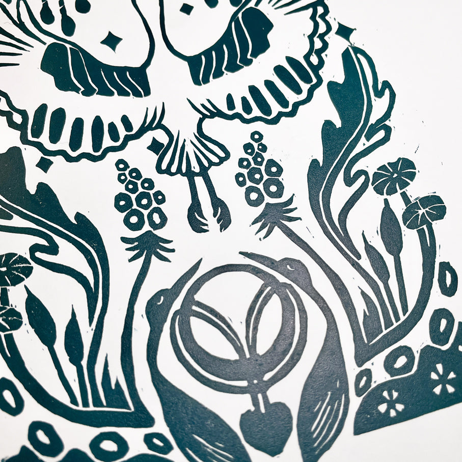 This is a hand-pressed block print. The design is first hand drawn, transferred to a block. I then carve it out, ink and press onto paper one at a time.