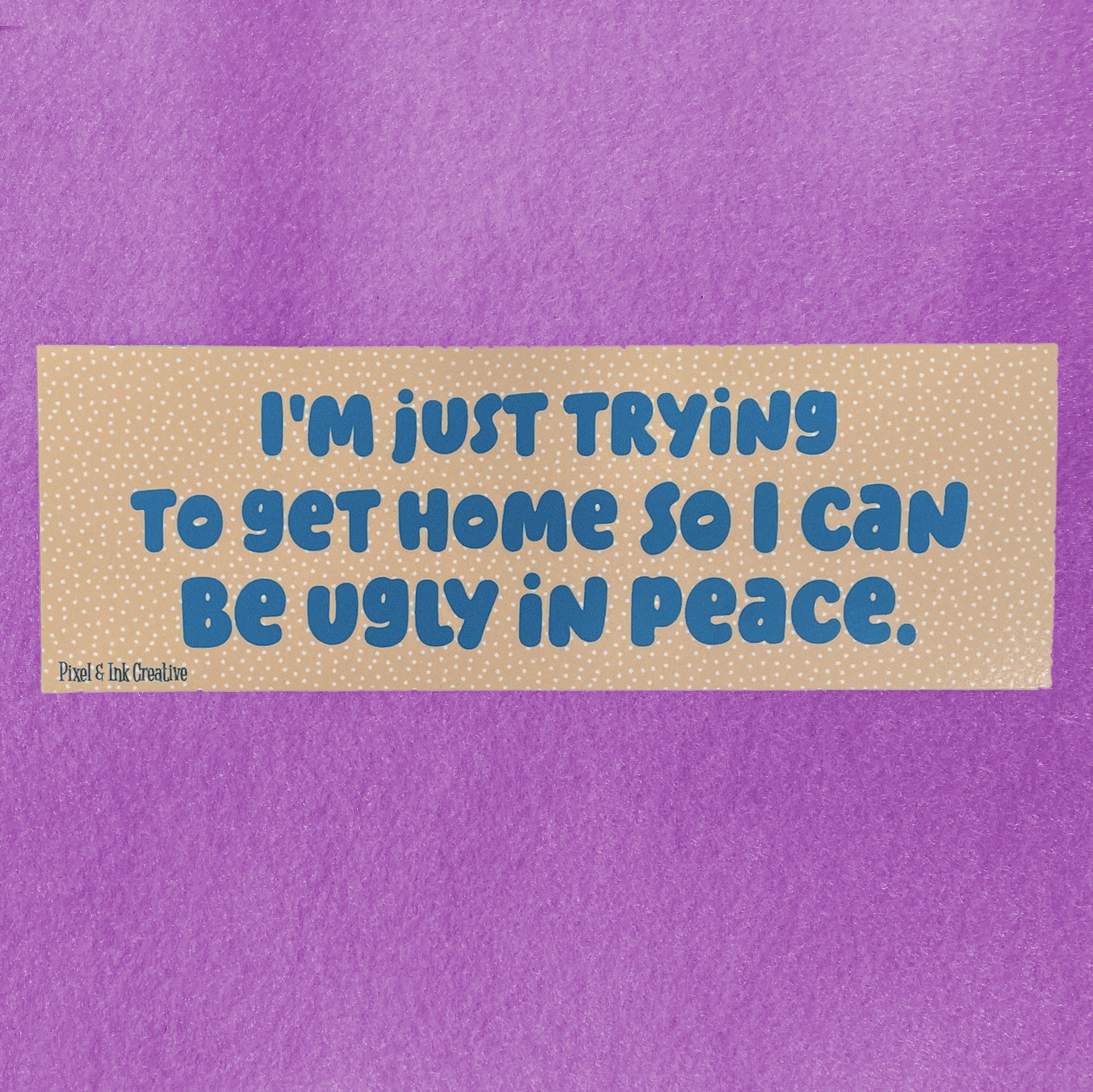 It's rough out here in these streets, and trying to be cute all day is for the birds! Our "I'm just trying to get home so I can be ugly in peace" bumper sticker is the perfect way to keep it real. Stick it on your car and let the world know you’re on a mission for your couch blankets, some cozy clothes and zero judgement. Perfect for anyone who would take coziness over appearances most days!